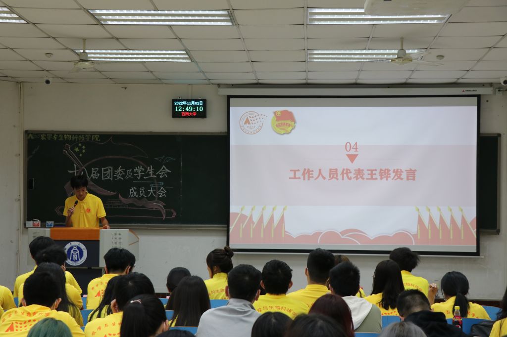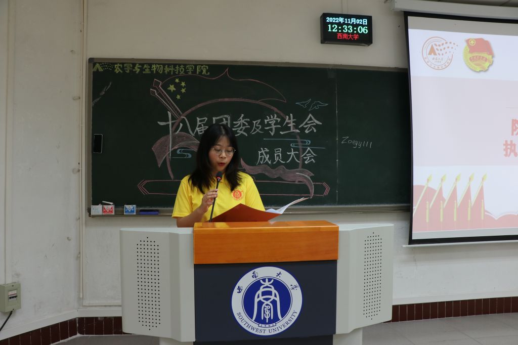 会议第一项,西南大学校学生会校主席团成员邓泽奕同学发言,他号召所有学生骨干应践行“全新全意服务同学”的宗旨,积极开展各项工作,同时通过强化政治引领,践行服务宗旨,勇于自我革命,切实塑造起新时代学生会清新阳光的形象。他强调,正值全校上下深入学习贯彻党的二十大精神之际,作为学生骨干,也应发挥好桥梁作用,不断团结带领广大学子坚定不移做时代好青年。“参与多深,领悟多深,投入多少,收获多少”,邓泽奕同学以自己的座右铭,来激励广大农生学子要积极发挥模范作用,在自己的工作岗位上认真履职尽责。