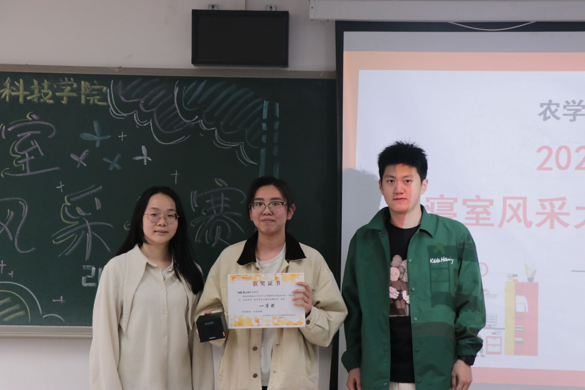 活动尾声,best365英国在线体育官网第十九届团委及学生会主席郭少宇同学和第二十届团委及学生会主席王瑞莹同学为获奖寝室颁发奖状和奖品,并合影留念。
