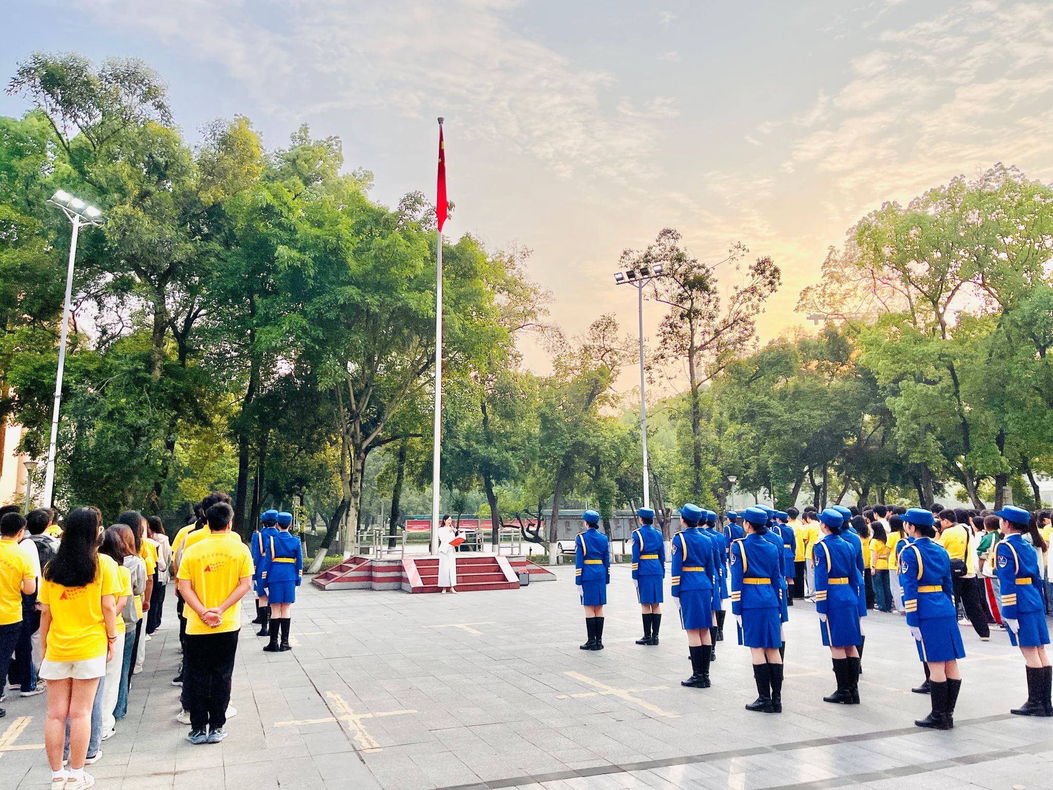 清晨7点,西南大学女子国旗班迈着整齐有力的步伐,护送五星红旗正步走向升旗台。全体师生面向旗杆,身姿挺拔,庄严肃立。随着激昂的《义勇军进行曲》奏响,五星红旗在晨曦中冉冉升起,师生们齐声高唱国歌,目光坚定地注视着国旗,现场气氛庄重而肃穆。