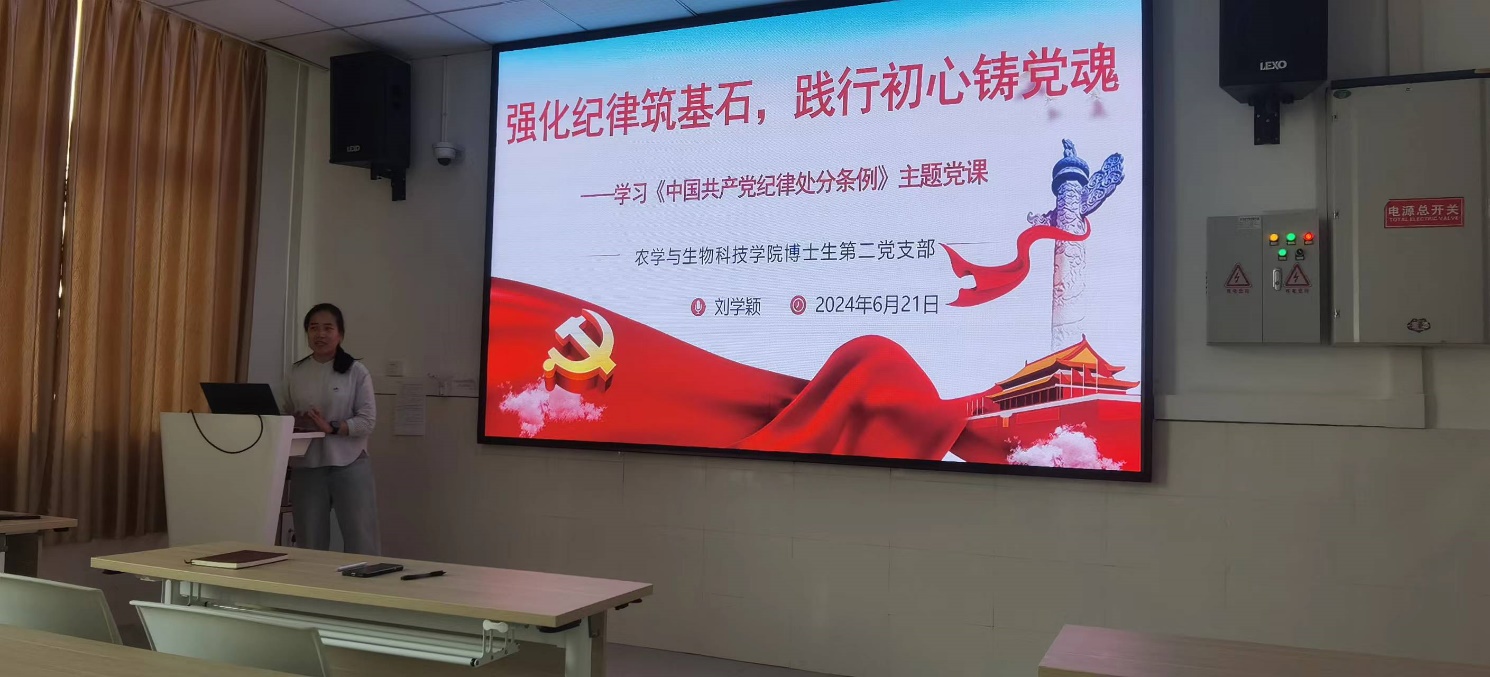 《条例》所有章节学习完毕后,支部书记刘学颖以“强化纪律筑基石,践行初心铸党魂”为题,为支部全体党员同志讲授了一堂纪律党课。她首先强调了《条例》学习在维护党章和党内法规、维护党的纪律和纯洁性、保障党员民主权利等方面的重要性,接着详细解读了《条例》颁布与修订的历史背景及精神实质,并列举了部分《条例》背后的案例故事。最后,刘书记寄语全体党员,作为农业领域的博士研究生,要将《条例》融入日常生活和工作中,不仅要做学术研究的先锋,更要做遵规守纪的模范,用实际行动诠释新时代青年党员的责任与担当。