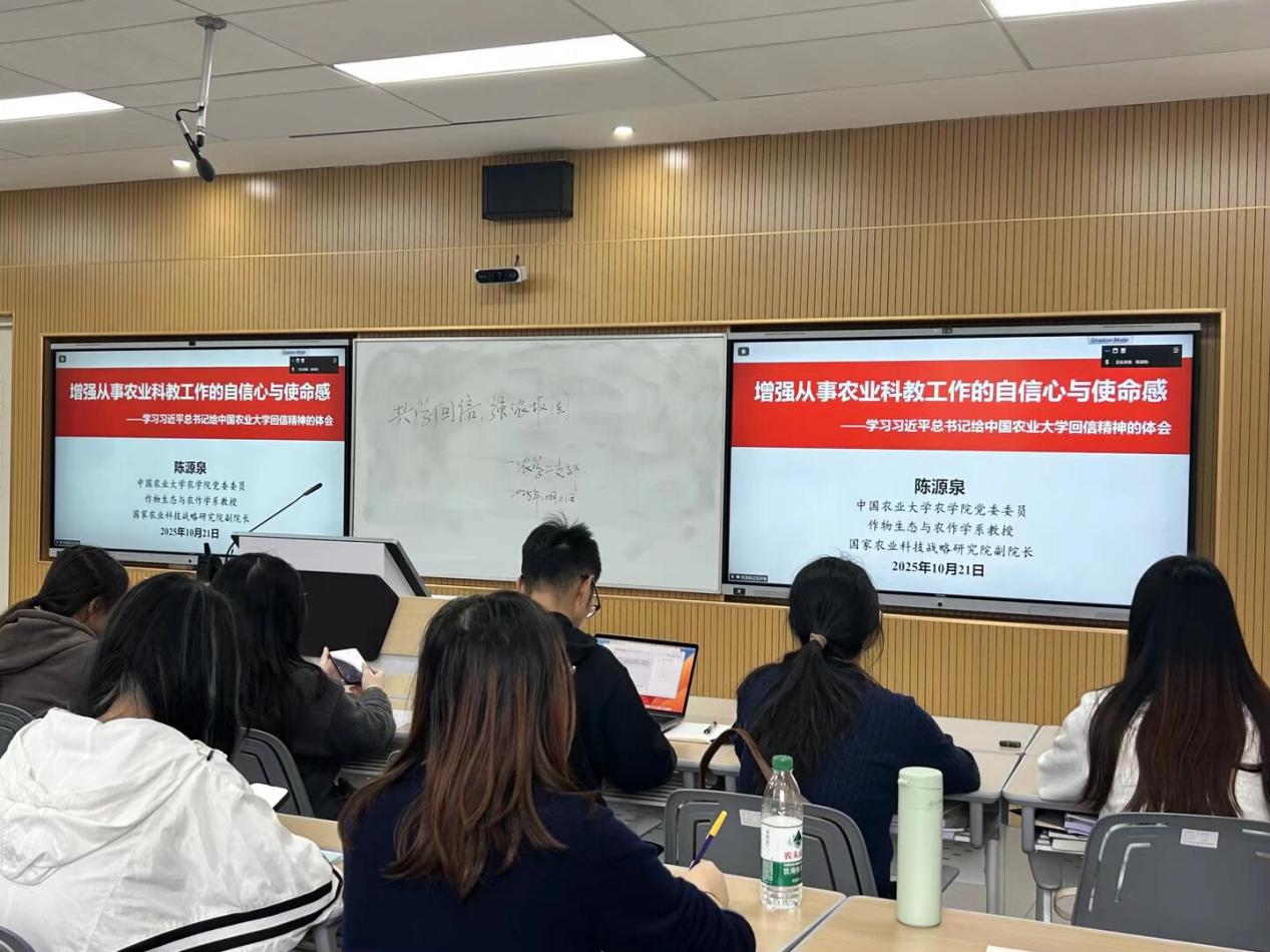 在领学环节,中国农业大学农学院党委委员陈源泉以“增强农业科技教育工作自信心与使命感”为核心,从历史维度与战略高度解读回信精神。他指出,要从中华民族伟大复兴的大视野中认识农业的重要性,从国家安全战略中强化强农报国的责任感,同时围绕 “深化教育教学改革、加强农业科技创新与成果转化、培养知农爱农专业人才” 三大要求,提出涉农高校需对标教育强国、科技强国、人才强国目标,将个人发展与国家需求紧密结合。
