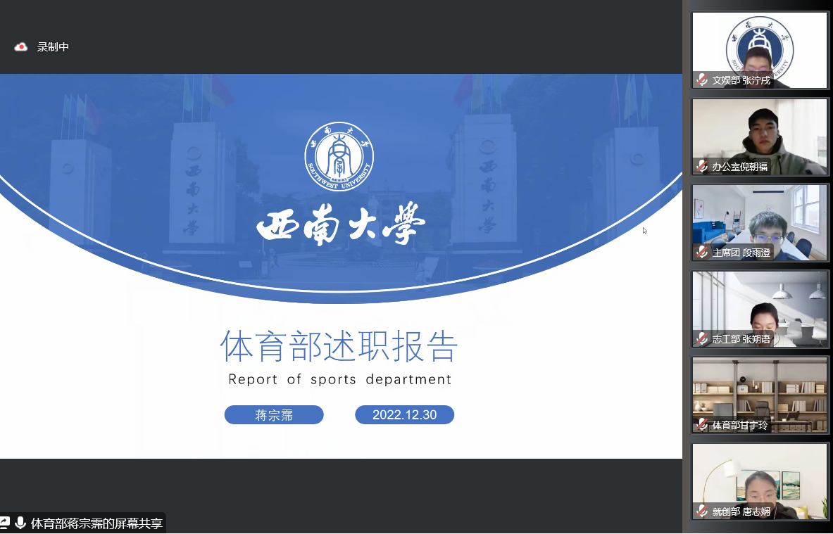 体育部负责人蒋宗霈同学就围绕本学期进行的三大重要体育活动进行了总结。他表示,秋季运动会最终因疫情延期,但体育部在前期的动员、训练环节中收获良多,并将AI体能大赛、世界杯科普讲解大赛的比赛情况与结果进行展示。他指出,在提升工作各项能力、及时汇报和妥善处理突发事件等六个方面仍存在问题,将对此进行思考与改善。