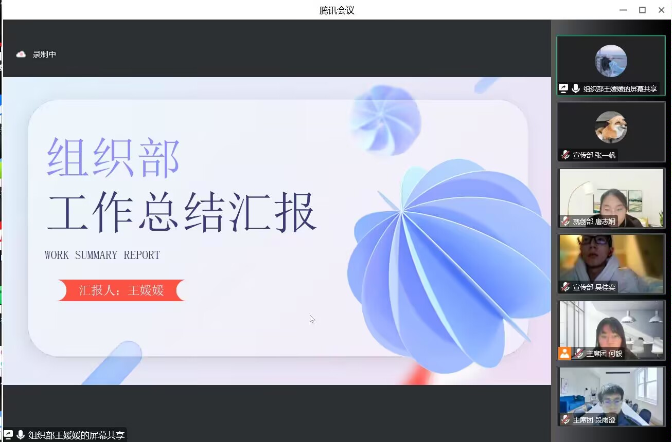 就创部负责人唐志娴同学总结本学期的“就业启明星工作坊”线上征稿活动、“互联网+”等赛事的总结和证书、奖状的收集和分发、校园招聘活动的推送和创客间栏目的打造以及部门招新、干事培养等工作。她指出三个主要问题:为同学们举办的就业创业培训会较少、部门资料未及时整理归档、活动宣传力度不够,并就此针对性提出协调资源争取老师的帮助、利用假期时间整理资料等解决方案。