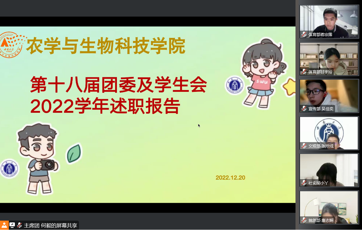为深入贯彻学习习近平新时代中国特色社会主义思想和党的二十大精神,落实共青团中央、教育部、全国学联联合下发的《关于推动高校学生会(研究生会)深化改革的若干建议》文件要求,不断提高学院学生会成员的综合素质,总结工作经验,12月30日晚7时,best365英国在线体育官网以腾讯会议形式于线上举行第十八届团委及学生会2022-2023学年秋季学期述职报告会。学院团委书记许莹竹老师出席会议,团委及学生会主席团成员、各部门负责人参会,会议由团委及学生会主席团成员何毅、段雨澄主持。各部门负责人代表制作ppt,利用图画、数据、文字等方式对本学期的部门工作进展和成效进行汇报,并对工作开展过程出现的问题进行总结反思。