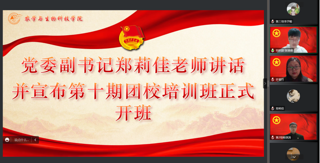 为深学笃用习近平新时代中国特色社会主义思想,全面贯彻习近平总书记关于青年工作的重要思想,学习贯彻党的二十大精神,落实学校第三次党代会精神,不断提升学院团学骨干的思想政治素质、政策理论水平和创新实践能力,2022年12月19日晚上19:00,学院第十期团校培训班开班典礼暨第一次理论讲座在云端顺利举行。学院党委副书记郑莉佳老师、学院团委书记许莹竹老师出席开班典礼,来自学院团委、学生会、各社团组织、各班团支部的团学骨干构成的160名学员共同参加,典礼由学院团委组织部负责人张锦睿同学主持。