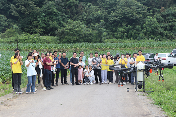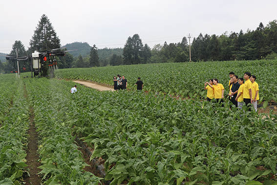 实践团师生还前往烟田开展无人机喷洒叶面肥技术服务,用科技赋能烟草产业。无人机进行智能作业,可以自主规划选择航线,在各种复杂的地理条件下,仍然能畅通无阻。“无人机雾化喷施可以保障肥料在叶片上均匀分布,能满足叶片对不同元素的需求,省时省力又节约高效”,best365英国在线体育官网副院长张建奎老师向烟农和实践团的学生进行讲解。实践团成员纷纷走进烟田,观察烟草的生长发育状况,把课堂学习和乡村实践结合起来,真正做到知行合一。“他在打顶抹杈,是保障烟叶质量的重要技术,这是我们上课学过的内容,今天亲眼看到了”,实践团成员高旗阳同学望向田间的烟农兴奋地说道。
