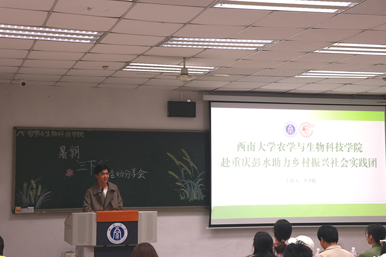 重庆江津寻椒小分队的熊中宇同学向大家介绍小队在江津慈云镇开展的“寻椒”之旅。成员们在花椒基地调研花椒种植情况与产业发展,与村庄农户交流花椒助力脱贫致富的生动故事,成员们还前往当地养老院慰问关怀活动,开展了针对老年人的防诈骗知识宣传。重庆长寿昌隆小分队的车艳奕同学,着重分享了小队结合专业优势开展的植物学课堂支教活动。小队成员借助显微镜等工具,将当地孩子们带入微观的植物天堂,激发孩子们兴趣的同时也加深对专业的认识,同时小队还面向农户开展了2023年中央一号文件宣讲、袁隆平精神宣讲等一系列丰富多彩的宣讲活动。