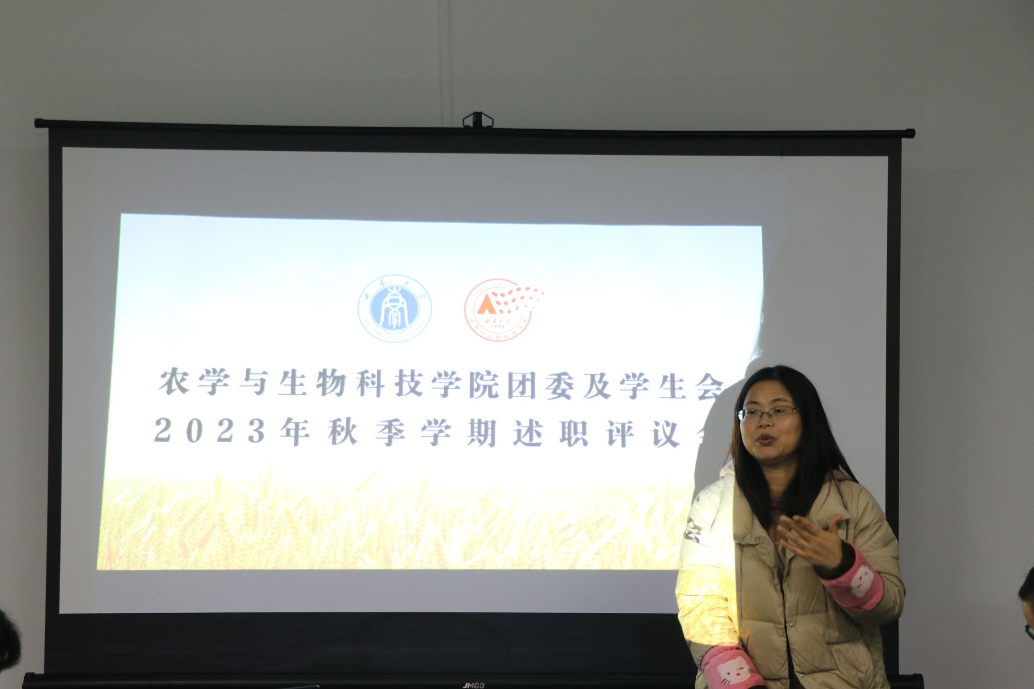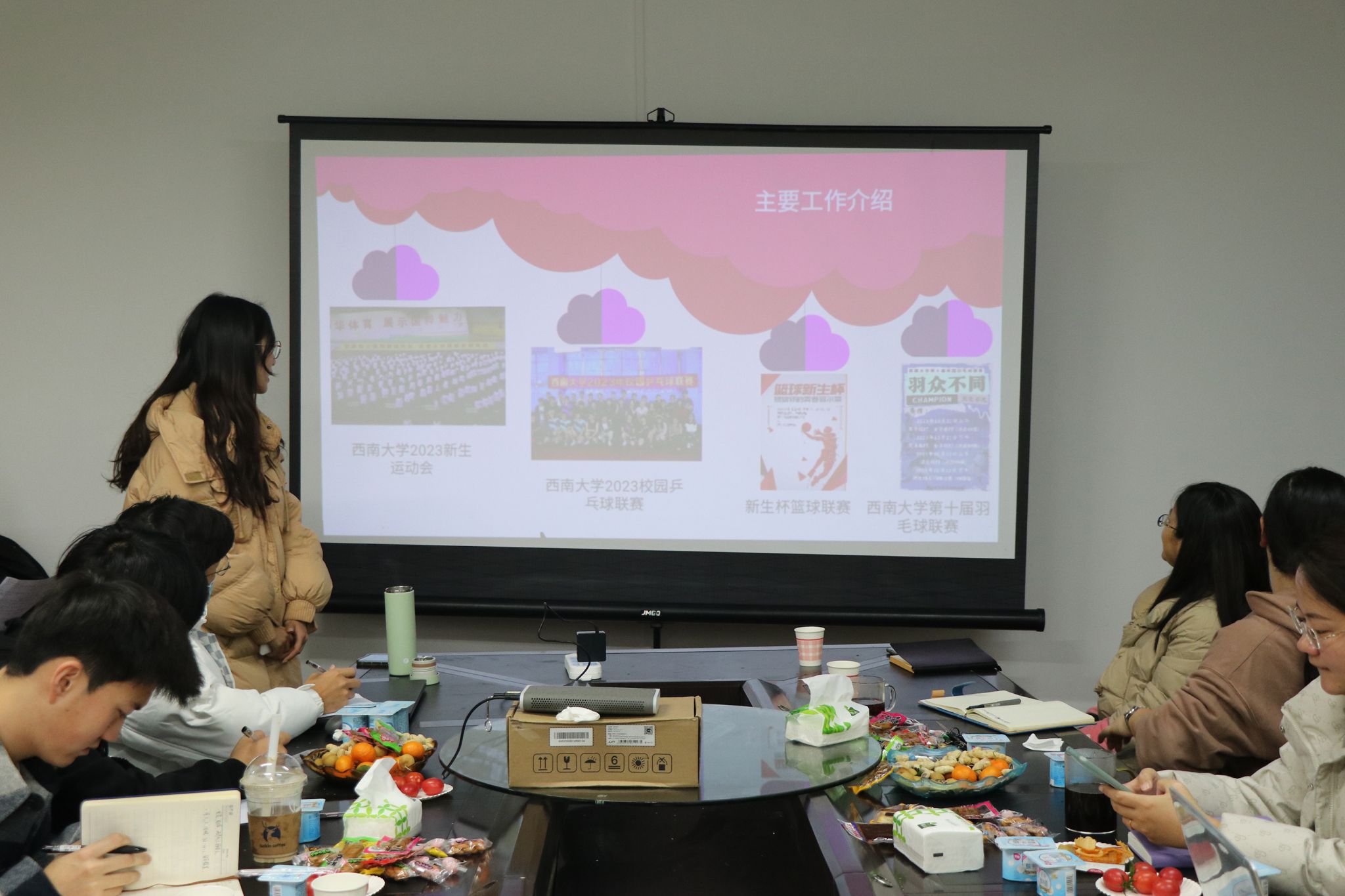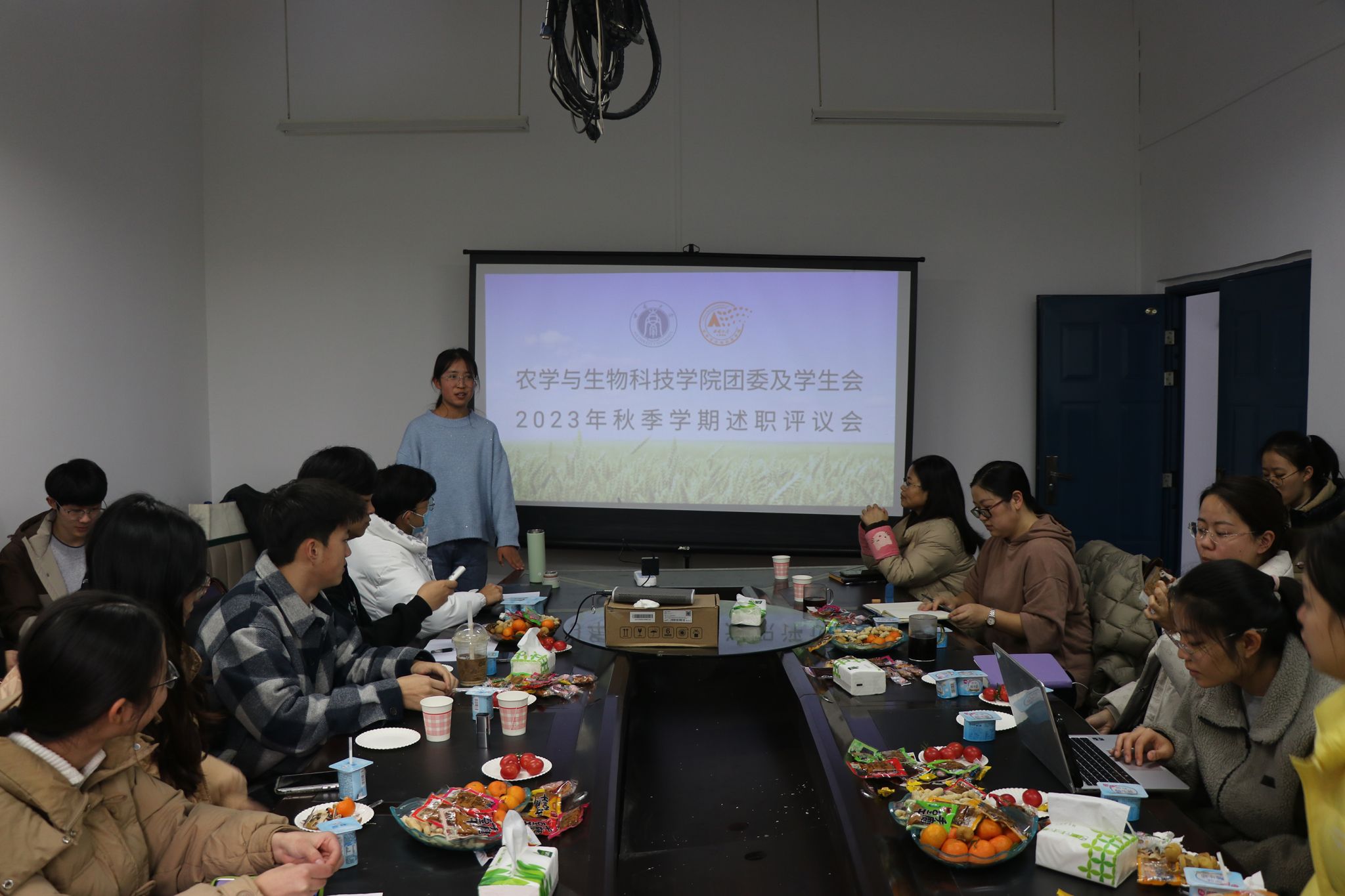 办公室负责人石文杰同学从丰收节、成员大会、新生运动会、迎新晚会、期末加油站等五个活动入手,总结了本学期的日常工作及活动参与情况,展示了办公室常规工作的开展情况。在部门的内部建设方面,他表示,办公室值班问题排班仍需改进。除此之外,他总结到,物资在线记录表是本学期精简流程的创新,将继续规范化、程序化物资借还与登记。
