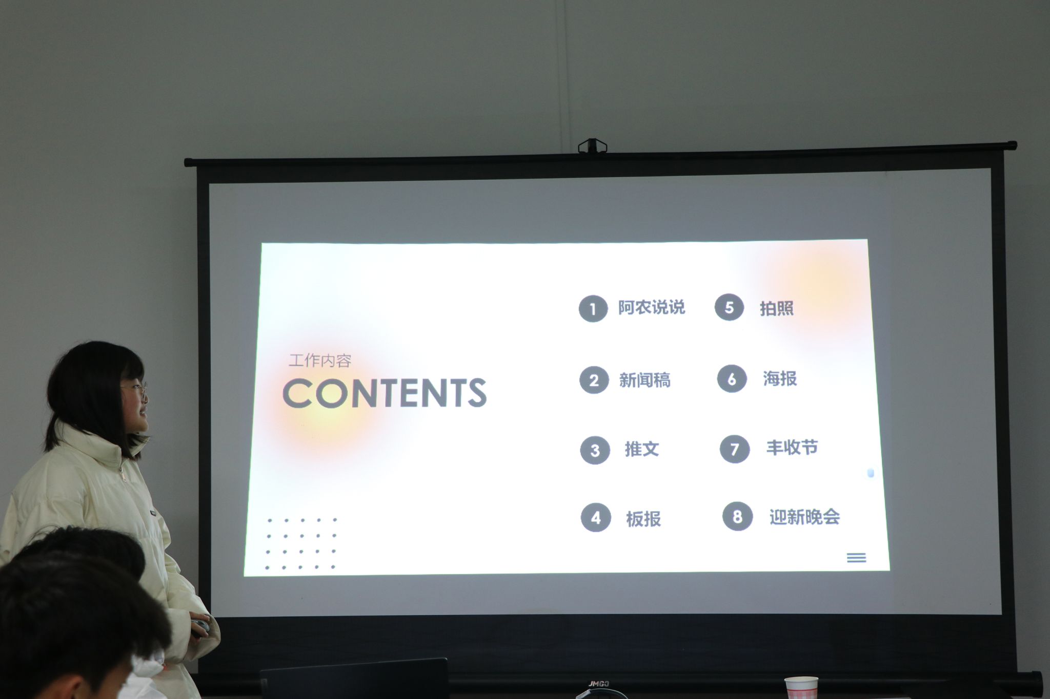媒技部负责人逯水源代表宣传部、媒技部进行述职,她从阿农说说、新闻稿、推文、板报、拍照、海报六个方面对工作进行总结,梳理本学期部门取得的宣传成效以及工作中存在的问题。