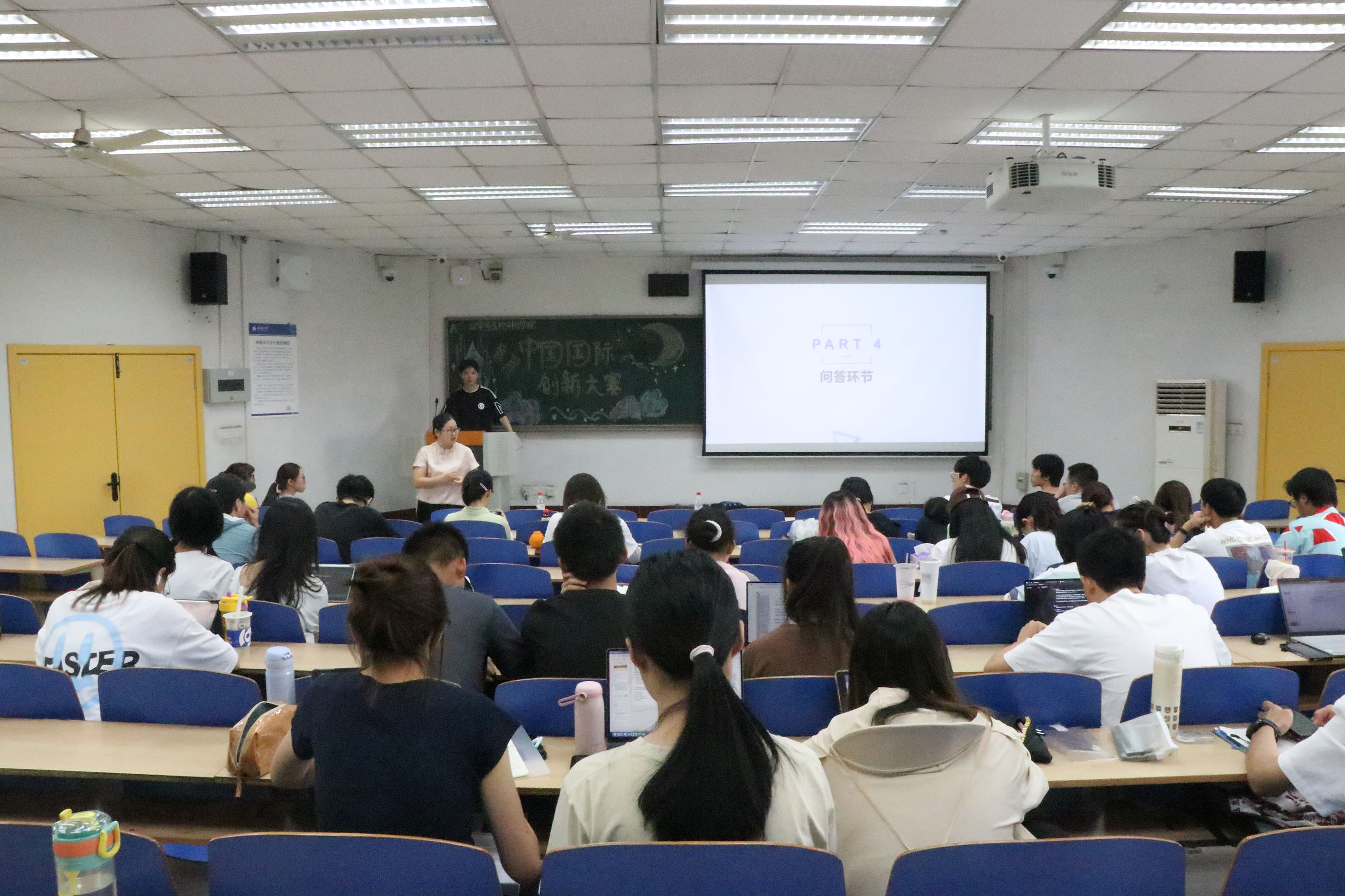 在答疑互动环节,同学们纷纷就自己困惑之处进行提问,许莹竹老师与汤杰臻同学共同进行解答。面对“如何寻找同伴”的问题,汤杰臻同学表示要根据需求,发布公告,通过收到的简历选择合适同伴,许老师建议可求助导师与其他老师为团队推荐合适同伴。