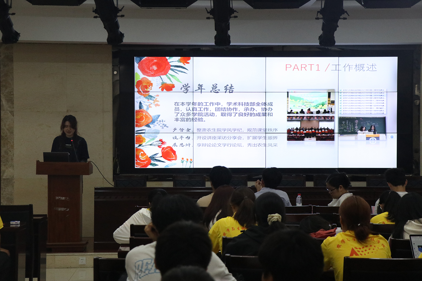 文娱部负责人豁逸帆同学从丰收节、中秋晚会、迎新晚会、英语展演大赛、毕业晚会等活动入手,总结了部门上一学年的工作成果,并提出“服务为先、严于律己、团结创新”的部门口号。