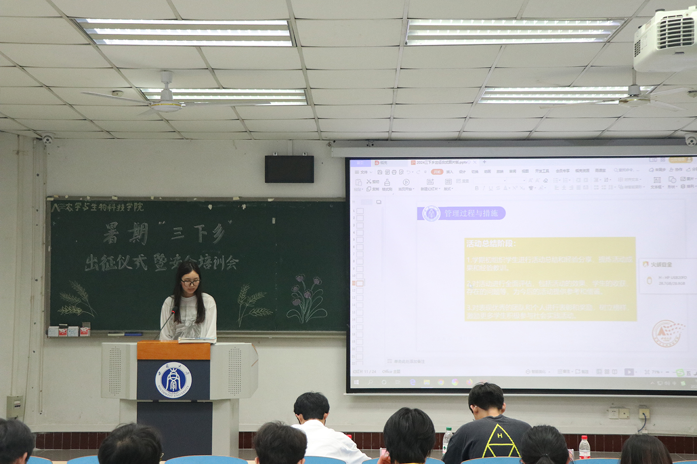 社会实践部陈静宜同学开展安全培训。她从总体原则、管理过程与措施、具体要求三个方面介绍社会实践团队的管理。同时,她就相关安全事项和应急措施对实践团成员进行安全培训,要求各小队成员保持通讯畅通,实践过程每日报告进展和安全情况。若遇暴雨、高温等极端天气状况,需灵活调整实践时间并报备,以降低风险。学院也为各实践小队分发了必备药品。