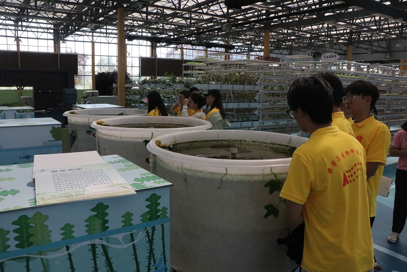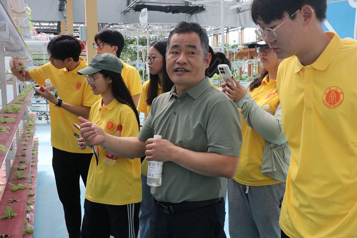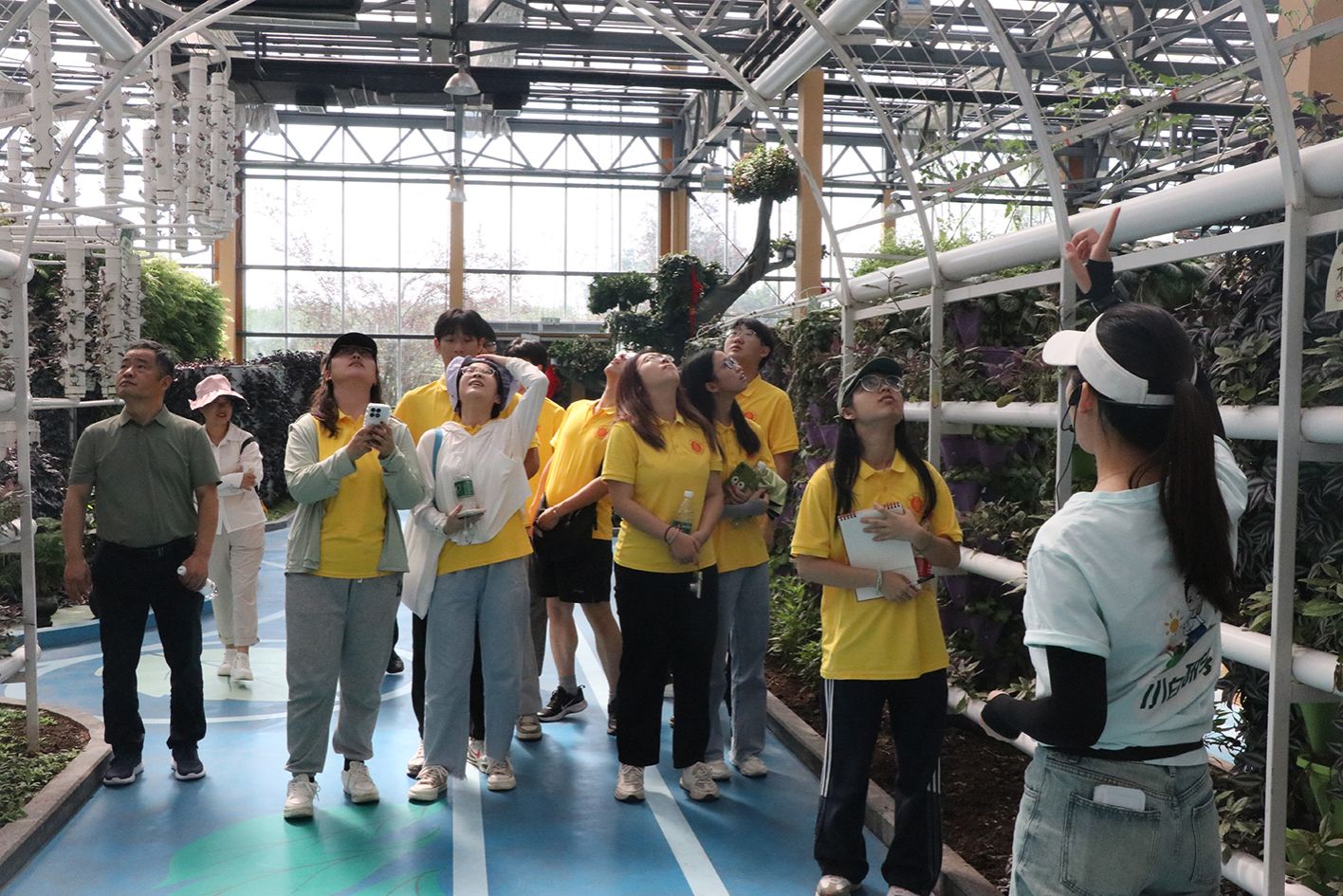 上午,实践团首先参观了集科普研学、数字智能、休闲娱乐、乡村旅游等功能为一体的金色黄庄大地乐园项目区。以农业科技为主题的1号场馆从育种、栽培、未来5G智能农业等方面集中展示最新农业技术成果,包含立柱水培、气雾培、立柱基质培、复合栽培等43种先进栽培模式,智能施肥机、水动力A字形栽培种植架等10项先进装备、290余种植物。馆内所有管道水培、滴灌技术采用智能化集中化的智慧农业管理,实现了人工成本和劳作时间的节约。智能化的管道水培和滴灌技术更是让同学们惊叹不已,大家纷纷感叹新时代农业科技发展迅速,未来现代农业发展可以探索更多可能。针对场内水培生菜长势不好的状况,实践团的徐新福老师立即进行了现场指导,指出水培管道流速缓慢、供氧量不足导致根系发育不良是主要原因,并提出了一系列切实可行的解决方案。徐老师深入浅出的现场教学,不仅解决了当前的技术难题,也让同学们对现代农业的精细化管理有了更加深刻的理解和体会,立志学好专业知识和技能以解决农业生产中的实际问题。