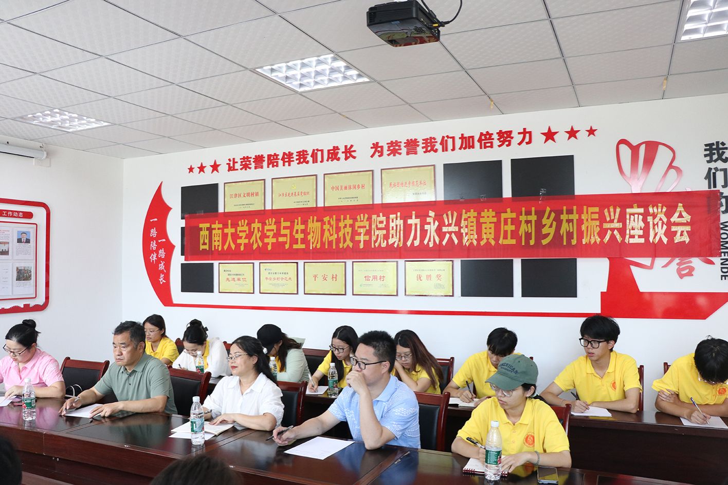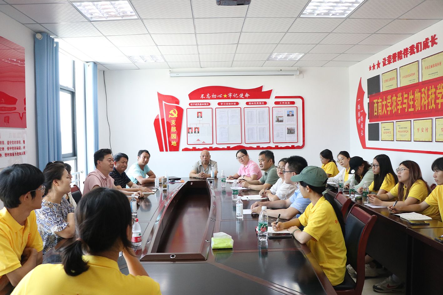 为了深入了解江津区永兴镇黄庄村在乡村振兴进程中所面临的机遇与挑战,为黄庄村乡村振兴建言献策,7月2日下午,西南大学best365英国在线体育官网师生实践团与黄庄村干部开展在黄庄村党群服务中心的会议室开展调研座谈会。学院党委副书记郑莉佳、团委书记许莹竹、油菜研究领域专家徐新褔、高粱研究领域专家肖前林以及实践团的同学们与黄庄村驻村第一书记喻华、永兴镇派驻黄庄村主任赵荣启、农机专业合作社负责人何锡文等基层干部面对面深入交流,共同为黄庄村的产业发展、人才振兴、乡村治理等谋划与建言。
