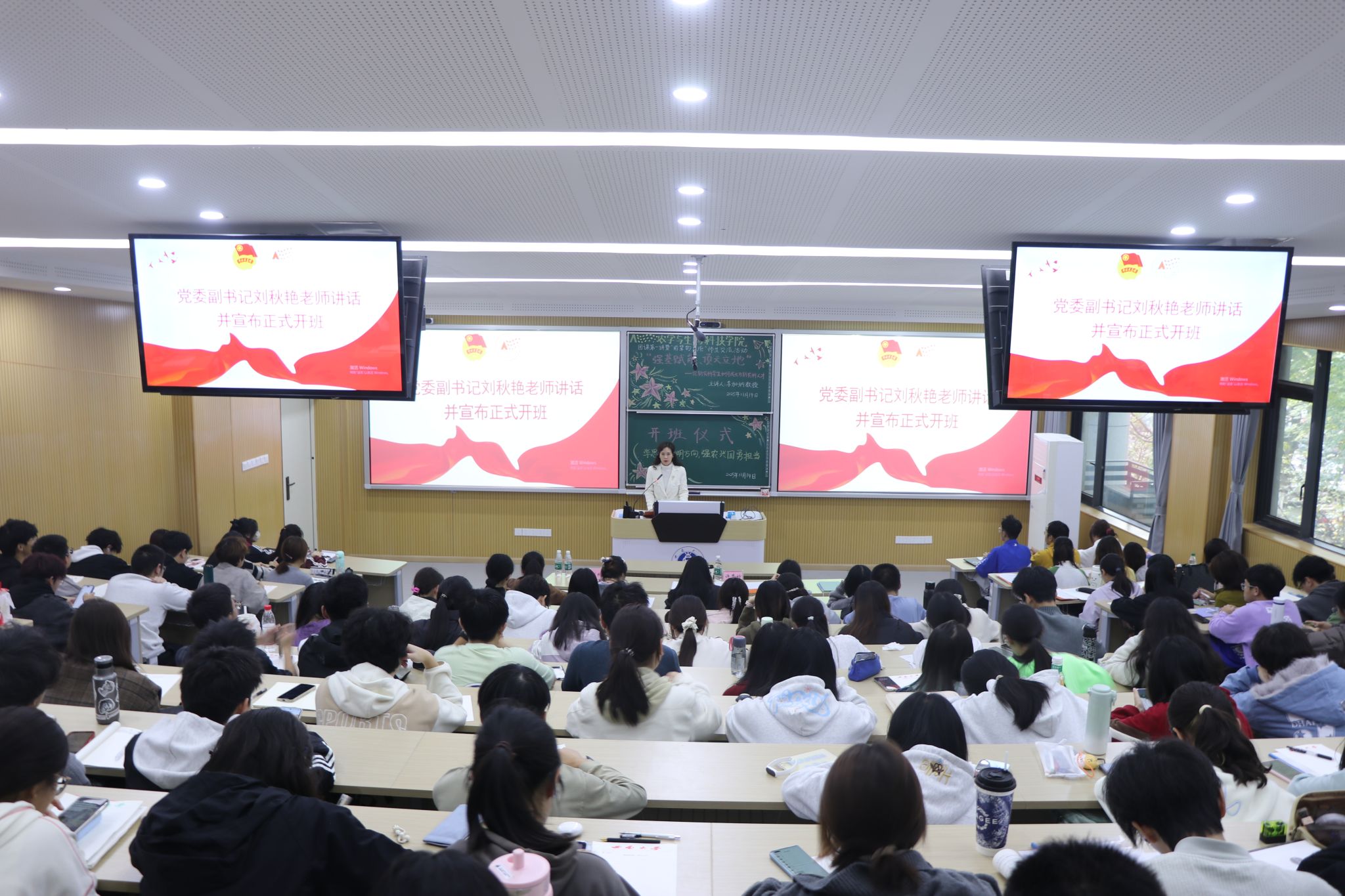 最后,学院党委副书记刘秋艳讲话并宣开班。她指出,团校培训是学院加强青年政治引领、培养青年马克思主义者的关键举措,更是学员淬炼信仰、提升能力的重要起点。同时,她从“坚定理想信念、勇于担当作为、锤炼过硬本领”三方面对全体学员提出殷切期望:一要筑牢信仰根基,做真理的“追光者”,深刻领悟党的创新理论内涵;二要勇担服务使命,做联系同学的“连心桥”,在服务集体中践行初心;三要锤炼过硬本领,做扎根实践的“实干家”,在学思践悟中提升综合素养,努力成长为能担重任的栋梁之材。