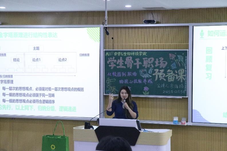 本次培训聚焦学生骨干实用技能,设置了清晰表达、高效工作、职场礼仪三大核心板块,内容兼具理论深度与实践指导性。在“清晰表达:结构化思维”环节,余海瑒系统阐释了结构性思维的核心理念。她结合麦肯锡经典的金字塔原理,从结论先行、以上统下、归纳分组、逻辑递进四个维度展开讲解,并通过列举贴近学生生活的场景案例,直观呈现了非结构化表达与结构化表达的差异,期间还与学员展开即时互动,课堂氛围轻松且高效。同时,她还援引《神奇的数字7》中大脑短期记忆规律,说明合理归纳分组对提升信息传递效率的重要性,引导学生骨干在日常沟通与工作汇报中运用金字塔原理,实现“想清楚、说明白”的表达目标。