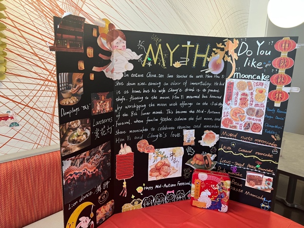 左上:大家准备的介绍中秋节由来的海报;右上:同学们书写的中华传统诗词;左下:同学们在食堂一同欢度中秋;右下:Brad副校长情不自禁地跟着学起了太极拳